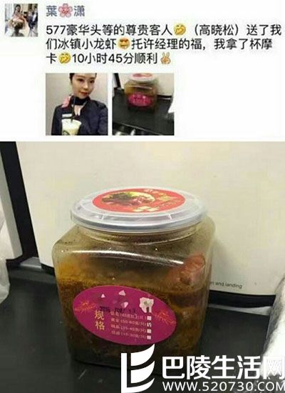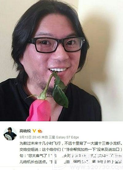 高晓松发微博:为熬过未来十几个小时的飞行,不远十里背了一大罐十三香小龙虾,刚登机,把罐子递给空姐说:这个给你们(“待会儿帮我加热一下”没来得及说出口),被空姐清脆地一句:“您太客气了!”然后转头和小伙伴说:“先生太客气了,还给咱们带吃的!一会儿给机长也送点”。我欲哭无泪,强颜欢笑,紧抱住我的小罐话梅。而在随后空姐的微博:“577豪华头等的尊贵客人(高晓松)送了我们十三香小龙虾,托许经理的福,我拿了一杯摩卡。10小时45分顺利”的刺激下,又忍不住哭诉:呜呜呜我过完安检登机前在登机口旁的小店刚买的一罐!往常这家有醉蟹,这回没了,就买了小龙虾,早知道自己捂热呀,没想到最后只剩下……粉丝看后纷纷表示高晓松老师太可爱了。还有机智网友变身福尔摩斯;大紧当时是寄希望于发了微博后,空姐刷微博一不小心看到了,然后赶紧把小龙虾还给他,但是没想到空姐先发朋友圈再吃最后刷微博。真是满满的套路啊。