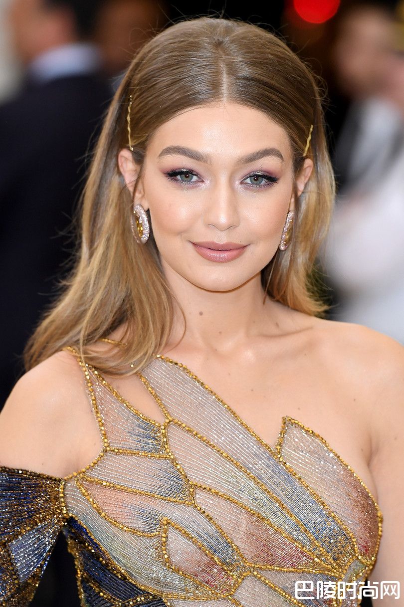 将妆容重点落在眼妆,以粉色、紫色、光泽白色打造出季闪亮又有优雅渐层的上下眼影,刷上根根分明的睫毛,与礼服搭配地十分巧妙。自然放下的头发中分并在太阳穴的位置夹上金色波浪形发夹,加上裸粉色唇彩,邻家感让Gigi Hadid瞬间减龄不少。