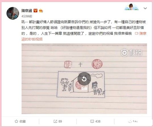 同时陈意涵PO出一支影片,影片里画出一栋房子,周边还有一男一女、一只狗狗及一个襁褓中的婴儿,更盖上陈意涵和许富翔的印章,除了承认怀孕,也流露出将和男友共组家庭的幸福。