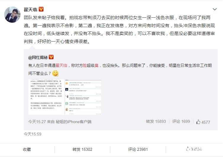 有网友爆料,在日本巧遇翟天临时,上前询问是否能合照,他一直头都没抬过,脸特别Chou(臭),说没时间。针对此事,翟天临还原当时经过,当时因为拍戏忘了带刮胡刀,外出购买时遇上2名女生,对方在现场一连问了她2次,第一遍我表示不合影,第二遍,我正在发信息,对方来问有时间没有,抬头冲深色衣服(的女生)说现在没时间,低头继续发,并没有不抬头。