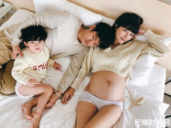 场景移到室内,林舒语换上杏色麻花上衣,短版剪裁衬托出圆滚滚的孕肚,简单搭配一件小裤裤躺在床上,老公则是依偎在她的肩头,儿子单穿尿布露出羞笑,互动超有爱。