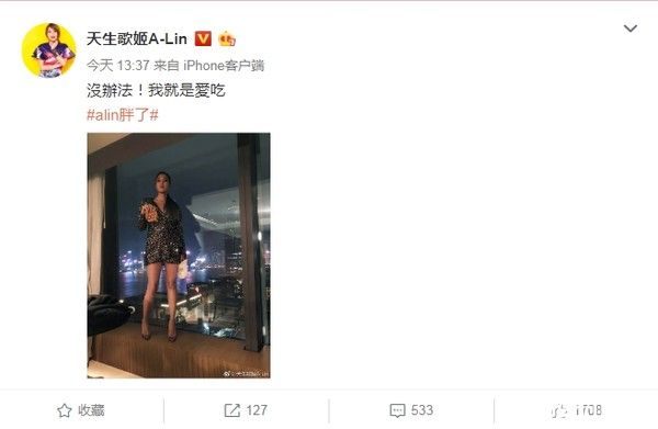 A-Lin本人发现自己的身材成为热议话题后,8日也在微博霸气发文没办法!我就是爱吃,来回应变胖的传闻。她同时也放上一张身穿短摆礼服,踩着高跟鞋站在窗边的美照,照片中的她大方秀出一双长腿,但手上的鸡蛋仔却更吸睛,也意外暴露了她的吃货本性。