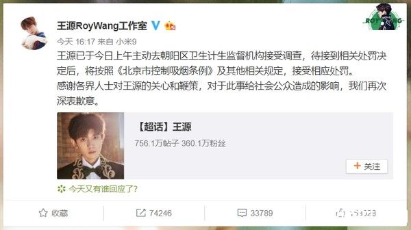 接受调查后,王源工作室在下午4点多发布最新进展:王源已于今日上午主动去朝阳区卫生计生监督机构接受调查,待接到相关处罚决定后,将按照《北京市控制吸烟条例》及其他相关规定,接受相应处罚。工作室也感谢各界对王源的关心和鞭策,并再次道歉,抱歉对社会公众造成如此影响。