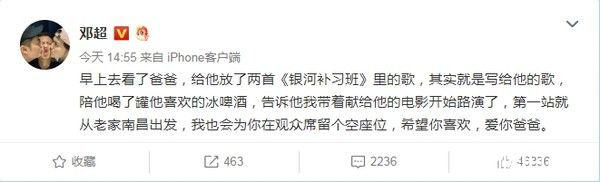 在电影公映前夕,邓超也带着冰啤酒去看了爸爸,给他放了两首《银河补习班》里的歌,其实就是写给他的歌,更向爸爸报告电影路演将从老家南昌起跑,我也会为你在观众席留个空座位,希望你喜欢,爱你爸爸。言简意赅的几句话,却隐含邓超对父亲的思念和深情,也感动了不少网友。