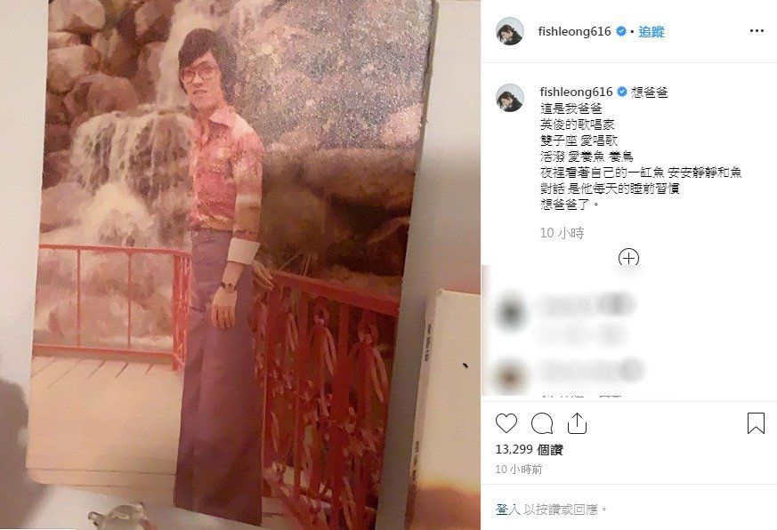 16日深夜梁静茹更是在IG贴上爸爸的旧照,写着:想爸爸,这是我爸爸,英俊的歌唱家,双子座、爱唱歌、活泼、爱养鱼、养鸟,夜里看着自己的一缸鱼,安安静静和鱼对话,是他每天的睡前习惯,想爸爸了。许多粉丝都到贴文处留言关心。