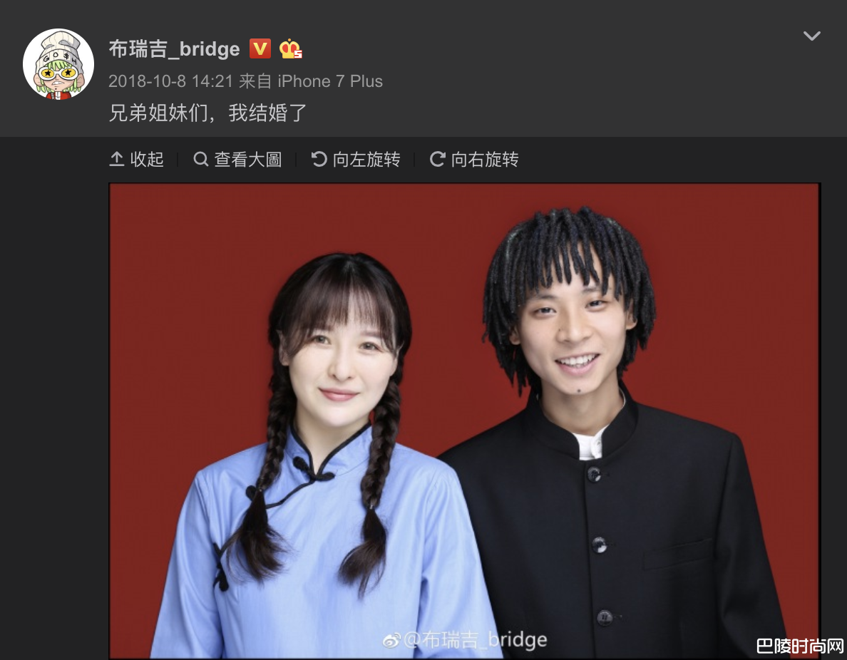 Bridge4月21日时在微博上晒出和老婆的婚礼现场的照片,而两人早在2018年10月8日时,Bridge在微博上宣布自己结婚了,并且晒出了两张与妻子的合照,时隔6个多月两人在昨日举办婚礼,而昔日比赛的好战友GAI、小青龙等人都到场祝贺,而两人的结婚照曝光后许多网友也发现Bridge瘦了许多,且原先在节目中的绿色头发染回了黑色,但是在近期Bridge的照片中又将头发染回绿色,造型相当百变。