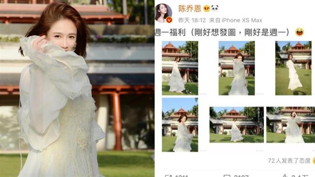 照片中身穿陈乔恩身穿半透明薄纱洋装,兼具时尚梦幻,时而动作俏皮,时而散发高贵气质,让人看了美不胜收。也因为下摆是蓬蓬裙,让不少网友开玩笑说:最近的服装都是这种遮肚子的,还有网友以为她在拍婚纱。
