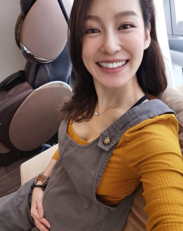 照片中,可以看到赵孟姿放下及胸长发,化上淡妆,气色看起来红润有精神,身穿芥黄色上衣,胸前挖深U剪裁隐约露出丰满北半球和深沟,搭配灰色吊带裤,右手捧着明显隆起的孕肚,笑得十分灿烂。