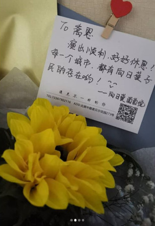 陈乔恩15日在Instagram透露,录完影收工回到酒店已经是半夜了,双腿也酸痛到快炸开,没想到,突然发现有位清秀的妹妹抱着一束花在大厅等她,对方害羞地说等了好久:乔恩~每一个城市都有向日葵子民的存在~。