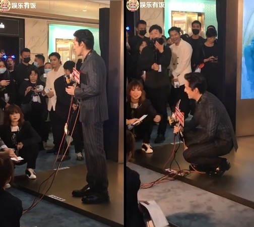 曝光影片中,身高185公分的胡歌西装笔挺、穿皮鞋,手拿众多麦克风正在说话,见到现场记者都蹲着提问,他担心说的话记者听不见,干脆蹲下来和众人面对面说话,直到工作人员提醒,他才又站起来,继续回答问题。除了接受联访,见到商场众多民众围观,也抬头放送微笑。