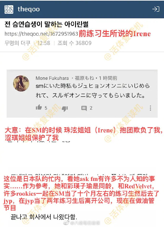 Irene耍大牌事件爆出后,有一位名为Mone的网友在社群平台上发文爆料,透露自己过去是SM练习生,期间曾经被Irene抱团欺负,还好另一名Red Velvet成员涩琪 (Seulgi)当时保护了她,她和Red Velvet成员和几个ROOKIES一起练习了10个月之后又转去JYP当了两年练习生,不过在TWICE出道节目《SIXTEEN》结束之后离开,除此之外,她还大爆不少有关当时可能成为TWICE预备出道成员之间的关系,其中更包括如今已经是大陆女团THE9成员的孔雪儿。