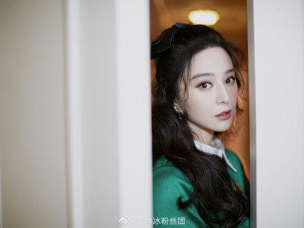 照片中,可以看到范冰冰放下及胸长卷发,后脑勺的地方别上一个超大发饰,身穿绿色衬衫,领口、袖口的撞色设计别出心裁,搭配同色系纱裙,再用素黑腰带系出纤细腰身,宛如真人版迪士尼公主。