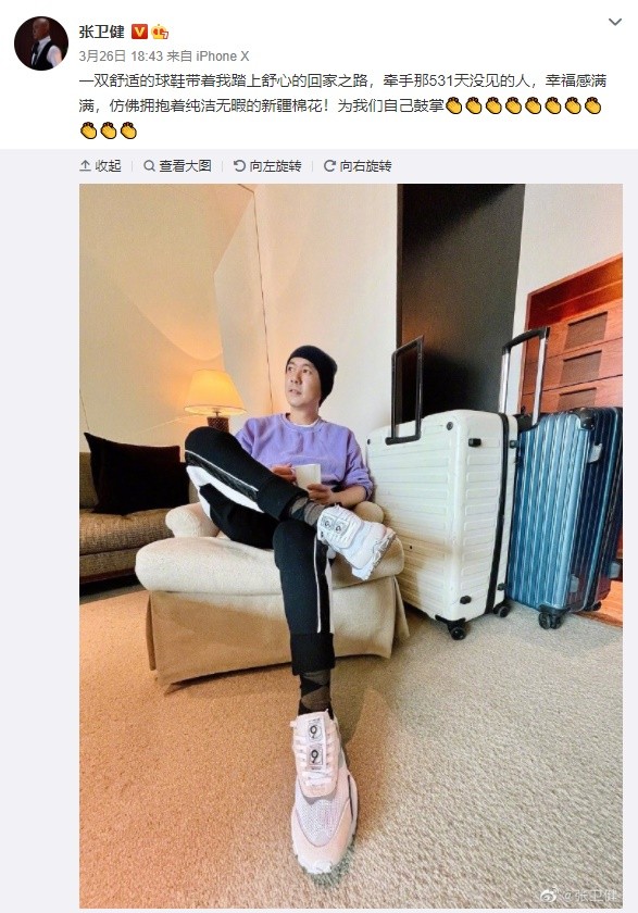 早在2个礼拜之前,张卫健就透露自已人在广东,当时他语带期待地说:一个人在广东度过21天的隔离时间,就可以见到515天没见过的一个人!值!如今,他再度更新微博动态,分享准备好行李、穿上鞋子的独照,疑似终于要结束隔离前往与太太团圆。