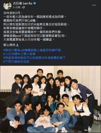 古巨基31日在脸书晒出与30年前跟训练班同学的合照,并回忆起当时因为只有CALL机,所以至今都未能找回所有当年的同学,希望藉由公开这张合照,利用网路的力量找齐所有人,最后为避免有时代代沟,还幽默地表示:不知道CALL机的请上维基百科。并标记入行30年的寻人启事。