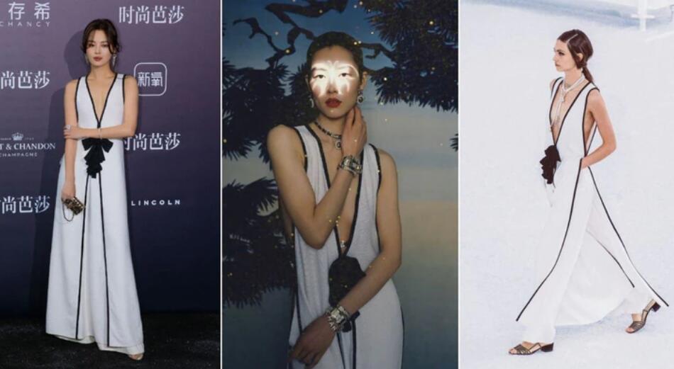超模刘雯日前登上美国版《Harper's Bazaar》封面,其中一组照片她穿着CHANEL 2021春夏系列裤装,一路开到肚脐的深V剪裁,让人眼睛一亮。这件衣服也被眼尖网友发现,和《如懿传》中饰演嘉贵妃的辛芷蕾、以及鬼怪新娘、韩星金高银撞衫。