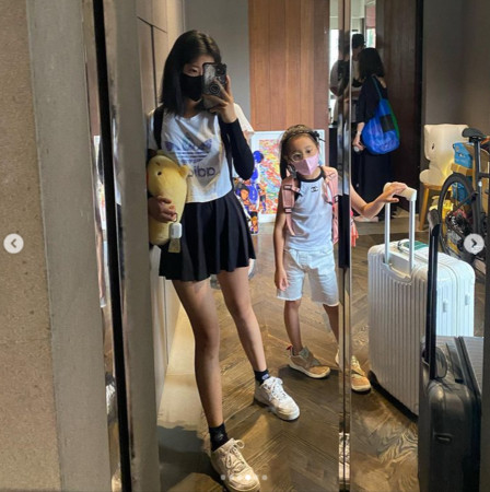 贾静雯上传Bo妞和彩虹合影的梦幻画面、咘咘顶着一头湿发的笑颜照、以及宛如公主的卷发美照,最后是梧桐妹牵着Bo妞的姊妹合照,大女儿身穿开深V的短洋装,裙摆似乎还有微开衩,辣露笔直美腿,许多网友看了不禁直夸:完美遗传妳的美腿基因!