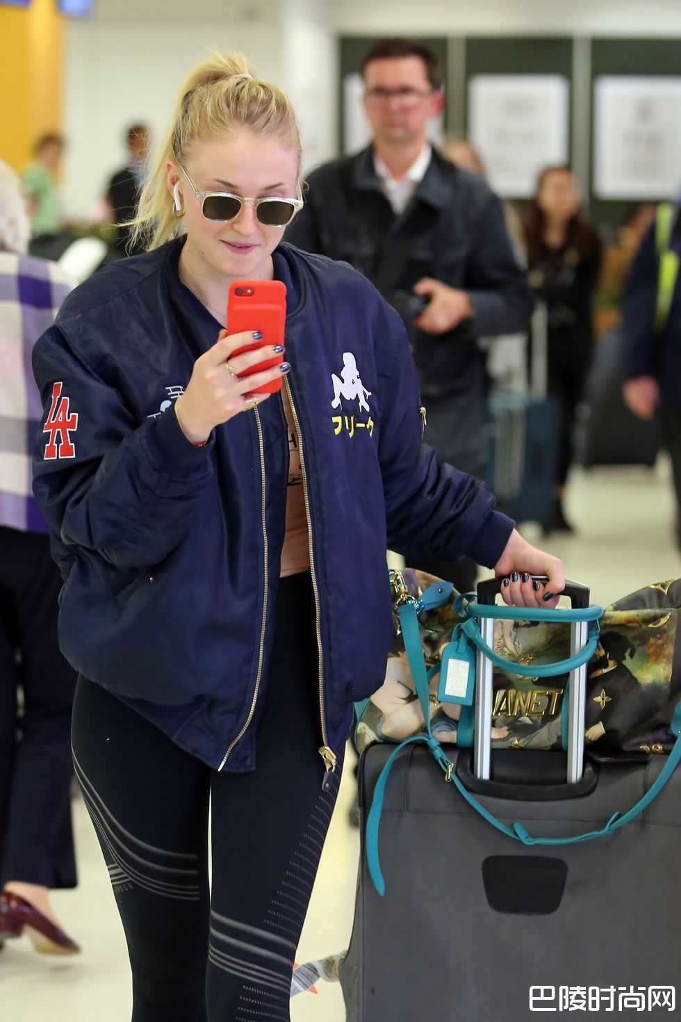 婚礼前一天便抵达苏格兰的珊莎苏菲透纳Sophie Turner,于机场以一身轻便运动服装现身。戴着墨镜的她,边走边以手机视讯(画面显示对象为未婚夫乔强纳斯Joe Jonas)。