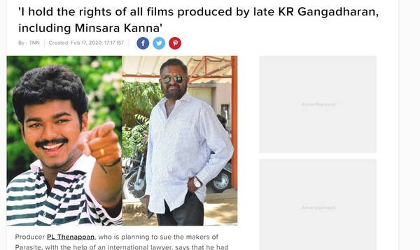 PL德纳潘接受印度媒体访问时表示,《寄生》的剧情和自己在1999年制作的电影《Minsara Kanna》极为雷同,接下来会聘请国际律师控告《寄生上流》,且也会索取赔偿,更不满过去许多印度片被其他国家的电影控告抄袭,这次只是要以牙还牙。