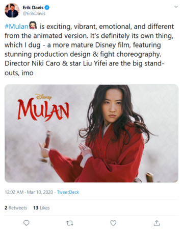 《Fandango》Erik Davis认为《花木兰》刺激、精彩、感动,跟动画版不一样,自成一格,而且是更成熟的迪士尼电影,具有惊人的动作设计与摄影风格,导演妮基卡罗跟刘亦菲表现太好了。