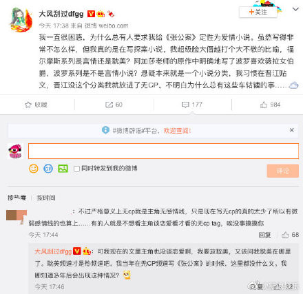 陆媒《新浪娱乐》转发《张公案》作者大风刮过近日的发文,内容提及我一直很困惑,为什么总有人要求我给《张公案》定性为爱情小说,虽然写得非常不怎么样,但我真的是在写探案小说。作者以福尔摩斯探案系列反问是言情还是耽美?她接着说悬疑就是一种小说分类,并且在晋江文学网站放入无CP分类。