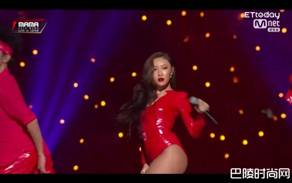 TWICE舞台结束,MAMAMOO紧接着上场,她们虽是第一次参加MAMA,但演出相当有气势,曾在演唱会上表演钢管舞的颂乐,身穿金色性感Bra与裤裙,带来一段性感又火辣的演出,最后华莎穿着紧身亮红色、裤子三角设计露出性感大腿,挟带女王气势霸气登场,全场看得目瞪口呆。