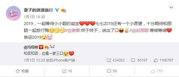《妻子的浪漫旅行2》未开播先轰动,网路上,各种夫妻阵容的爆料层出不穷,而官方微博最新PO文更疑似泄漏了新名单,在1日转发了赵丽颖、冯绍峰宣布怀孕的文章,并表示:2019,一起等待小小颖的诞生,七七2019还有一个小愿望,十分期待和丽颖一起旅行呀!一起旅行4个字,更引发网友热议。