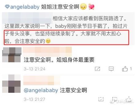 随后有知情人士回应此事,相信大家都看到医院照片了,这里说明一下,Baby刚刚录节目手戳了。照过X光之后确定骨头没有异状,而是肌肉拉伤,但她没有多休息,而是接着返回现场继续拍摄,相当敬业,同时也安慰粉丝:大家不用太担心,会注意安全的。