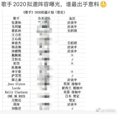 《歌手2020》也即将在明年播出,近日网路上曝光一份拟邀名单,众多大咖歌手赫然在列,例如张惠妹、蔡依林、林俊杰、杨丞琳、田馥甄、艾怡良等,名单简直超华丽!不过蔡依林和林俊杰的栏位已被写上无档期,但张惠妹、杨丞琳和田馥甄的栏位则是写着洽谈中,而艾怡良的栏位更是已被打勾,让歌迷又惊又喜纷纷燃起希望,在网路上引发一波热议。