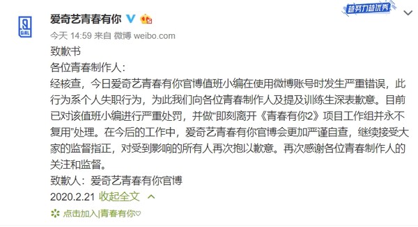对此,《青春有你》节目组火速处理,1个小时后就在微博发文致歉:官博值班小编在使用微博帐号时发生严重错误,此行为是个人失职行为。节目组表示已严重处罚该小编,当下就要求对方离开工作组,并且永远不再录用,官博会更加严谨自查,继续接受大家的监督指正,对受到影响的所有人再次抱以歉意。